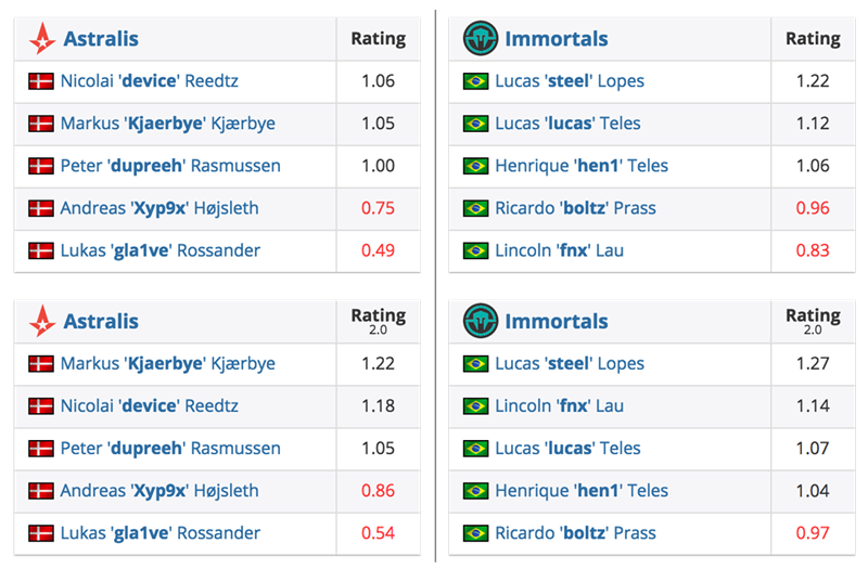 另一个例子,在Eleague Major上Astralis和Virtus.pro的决赛时,在地图Overpass上,Xyp9x有着突出的表现,但是使用Rating 1.0时,他只有1.25的数值,落后于Snax的1.33。