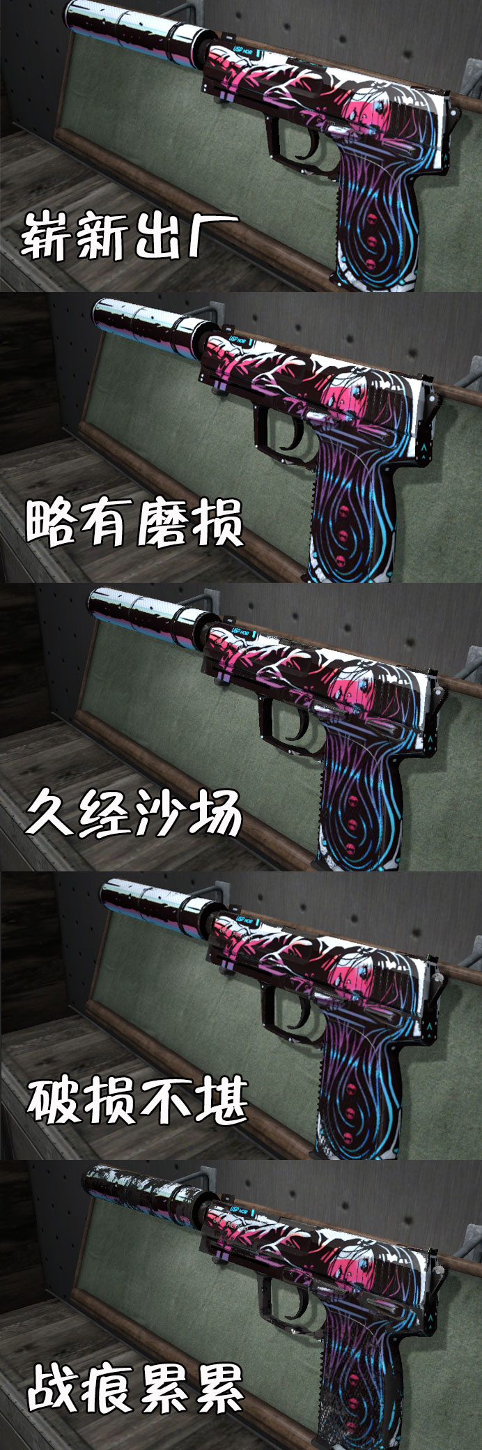 黑色魅影的价格已经属于USP中价格很高的皮肤了,二次元小姐姐设计出众、不太吃磨损、又是CT初始枪,所以备受追捧。推荐低磨损久经和略磨,性价比较高。当然追求顶级磨损的玩家,请开始你们的表演。