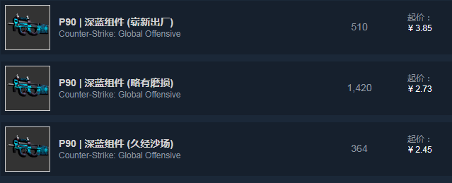 深蓝组件算是一款冷门P90皮肤,尽管不贵,但平时出场几率也不高。因为论便宜比不过精英之作和冷血无情……而不吃磨损的特点也让深蓝组件不同磨损价格差距很小,崭新才4块钱,略磨、久经2.5元左右。所以还是那句话,随便选。